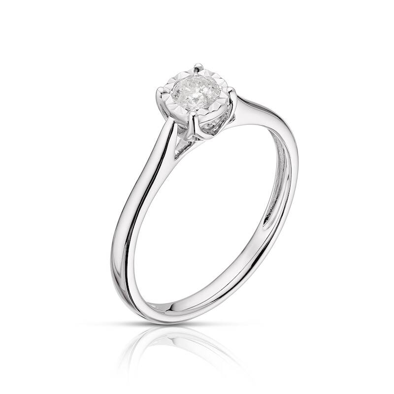 A traditional solitaire ring crafted from 9ct white gold. Distinguished by a sparkling round-cut diamond in an illusion setting. This type of setting enhances diamond for a bold look. The total diamond weight of this ring is 0.17ct.