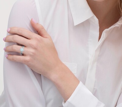 A wintry pear-shaped aquamarine is the striking focal point of this spellbinding ring.