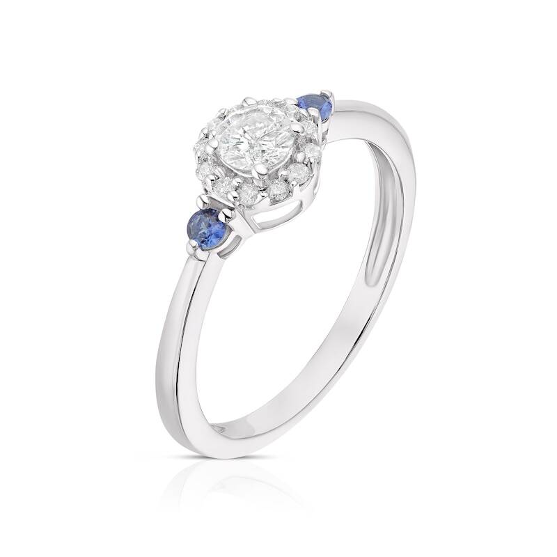Experience elegance and sophistication with our halo diamond centre piece ring, accentuated by vibrant blue sapphires on either side, a mesmerizing fusion of timeless diamonds and vivid hues.