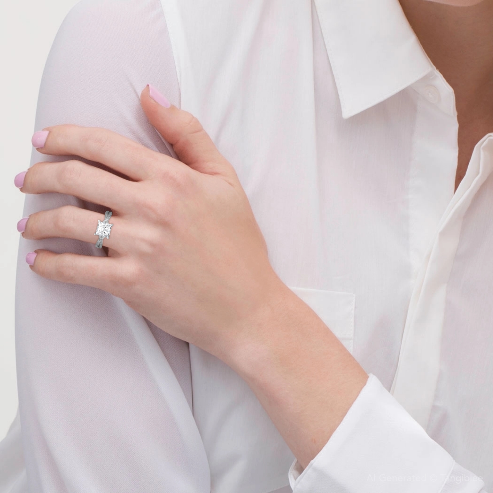 • The 2-carat princess-cut lab-grown diamond steals the show in a classic four-prong setting
