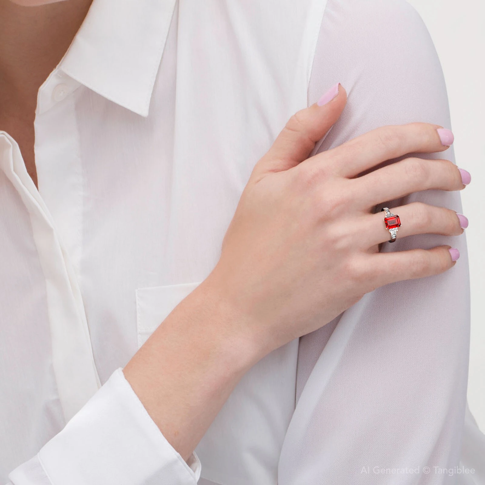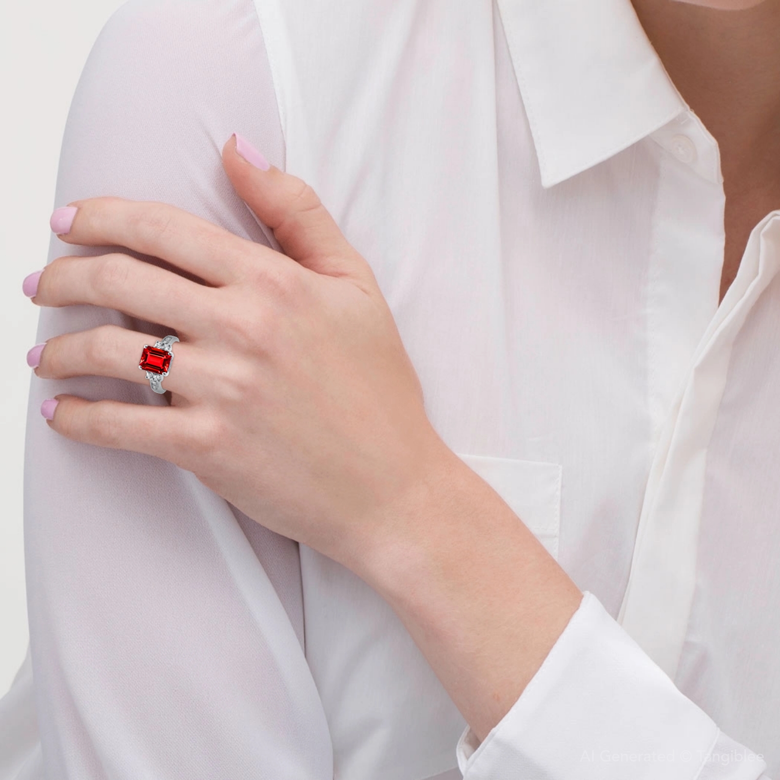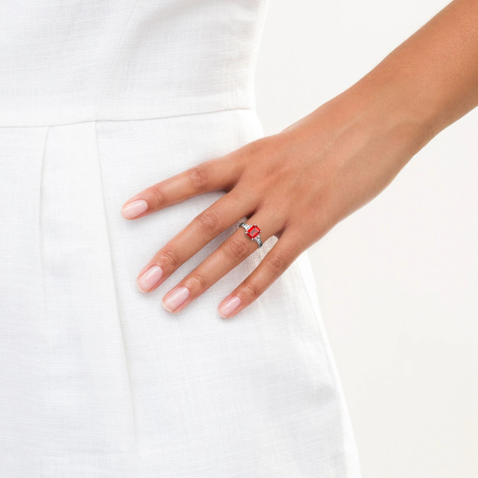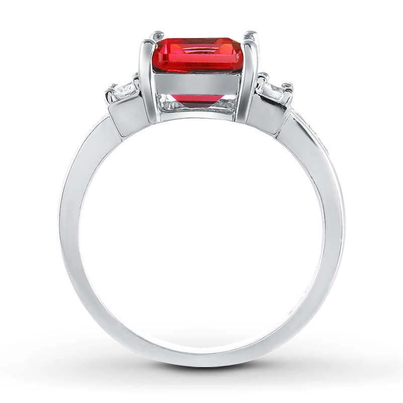 An emerald-cut lab-created ruby twinkles at the center of this sterling silver ring. Shiny round lab-created white sapphires add sparkle.