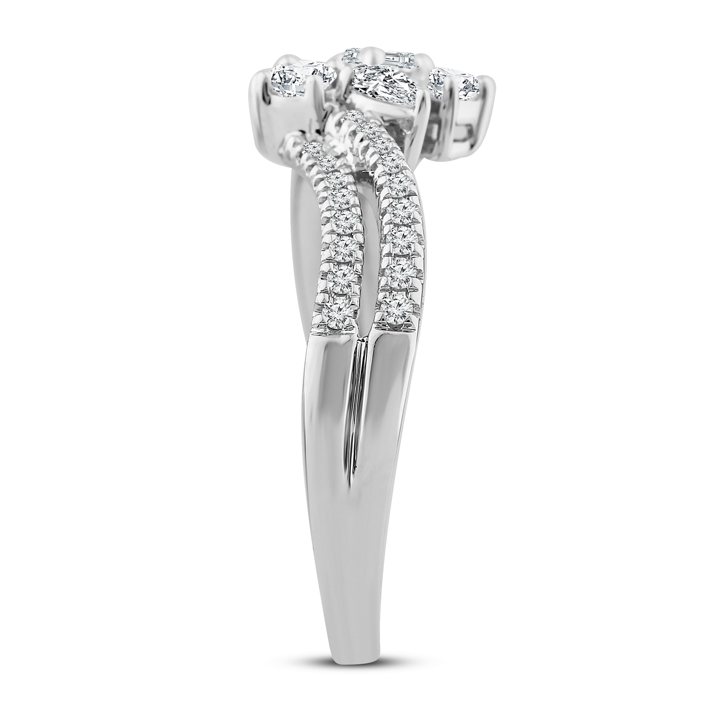This enchanting diamond ring from the Everything You Are? collection features five distinctively-shaped diamonds, symbolic of everything she means to you. Each diamond shape has a different meaning, from integrity and wisdom, to confidence, totality, and elegance. The beautiful 10K white gold ring features an oval-cut, emerald-cut, pear-shaped, round-cut, and princess-cut diamond at the center, while ribbons of brilliant round-cut diamonds flow outward. The gorgeous ring has a total diamond weight of 1/2 carat.