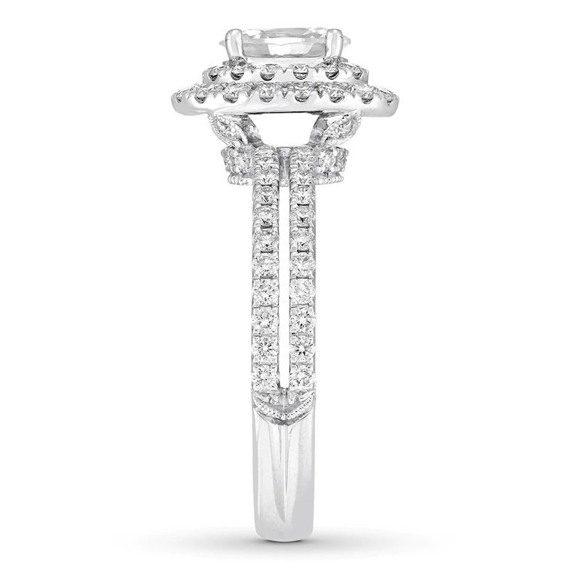 This Neil Lane Bridal engagement ring embraces the modern beauty of the halo design. The brilliant 1-carat oval-shaped diamond center reflects Neil Lane’s passion for vintage designs, while round diamonds add sparkle to the split-shank band. The diamonds total 1 3/4 carats in weight.