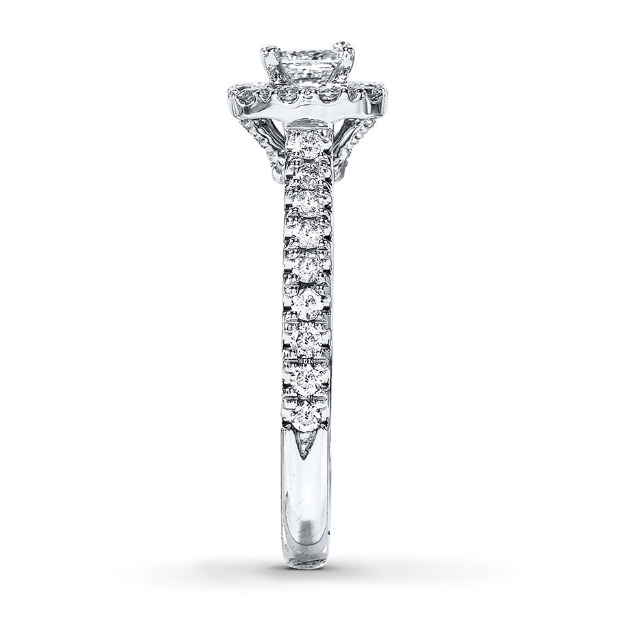 A princess-cut diamond takes center stage in this dramatic engagement ring for her from the Neil Lane Bridal? collection. A supporting cast of round diamonds frames the center and lines the band of 14K white gold for a design worthy of applause. The ring has a total diamond weight of 7/8 carat.