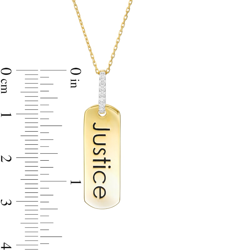 Wear your values with pride with this statement-making diamond pendant from the Wonder Woman Collection. Crafted in warm 10K gold, this petite tag features the word "Justice" inscribed vertically along the center. Diamonds line the bail for a hint of sparkle. Captivating with 1/20 ct. t.w. of diamonds and a bright polished shine, this pendant suspends along a 16.0-inch cable chain with 2.0-inch extender that secures with a spring-ring clasp. The Wonder Woman Collection of fine jewelry at Zales is inspired by one of the most beloved and iconic DC Super Heroes of all time. Embodying strength and grace, Wonder Woman is a modern-day warrior. This exclusive fine jewelry collection inspires you to wear your strength, confidence and power.