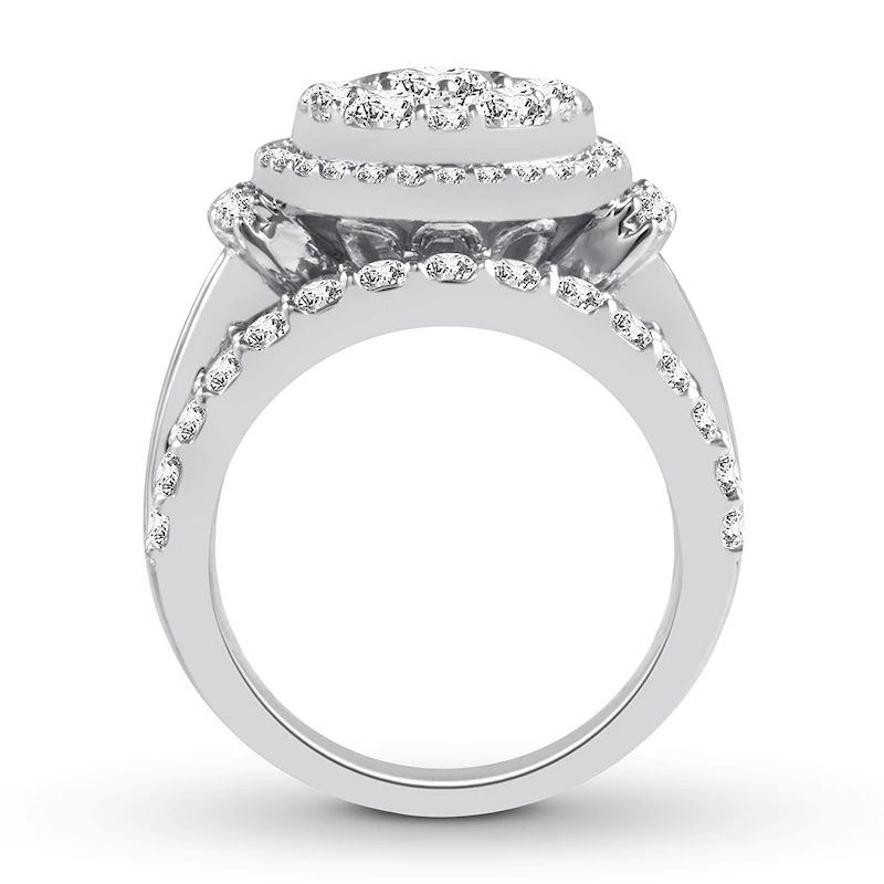 Imagine her surprise when she sees this unforgettable engagement ring. With a center arrayed in dazzling round diamonds, the ring is sure to capture attention. The band showcases a sparkling row of round diamonds at the top and bottom with a line of baguette diamonds in the center to complement. Styled in beautiful and versatile 14K white gold, the ring has a total diamond weight of 3 1/2 carats. From the Adore? bridal collection. Available online while supplies last. Previously Owned Treasures are not eligible for in-store pickup. Previously Owned Treasures may only be shipped either to your home address or to an alternate address.