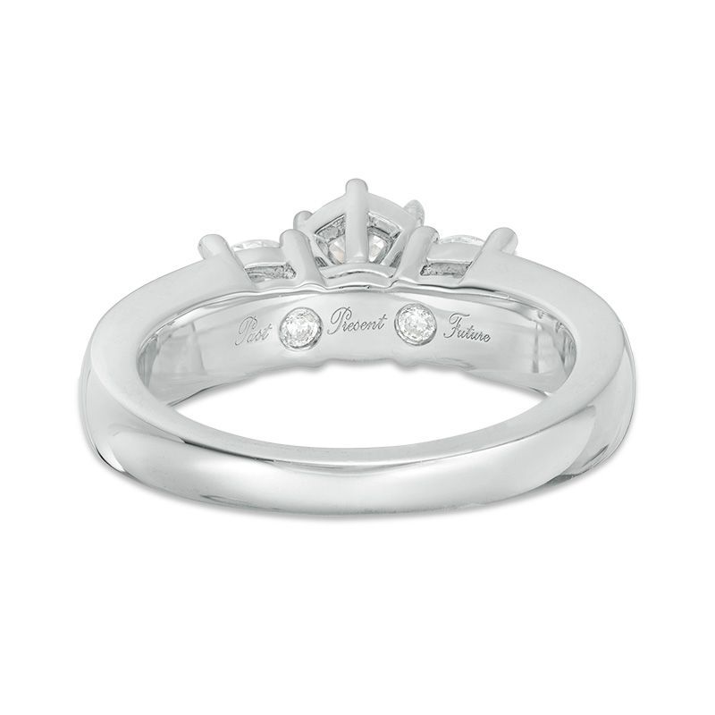 On the day you ask for her hand in marriage, honor her with a three stone diamond bridal set that honours love's past, present and future. Exquisite in 14K white gold, the engagement ring dazzles with three round diamonds as its focus. These three stones stand tall against a shank lined with accent diamonds. On the inside of the ring's shank, the words "Past, Present, Future" and two small round diamonds complete the look. On your wedding day, complete the ensemble with the coordinating wedding band, which also features three round diamonds flanked by round stones set into the shank. Radiant with 3 cts. t.w. of diamonds and a polished shine, this ring is an amazing look for an amazing woman.