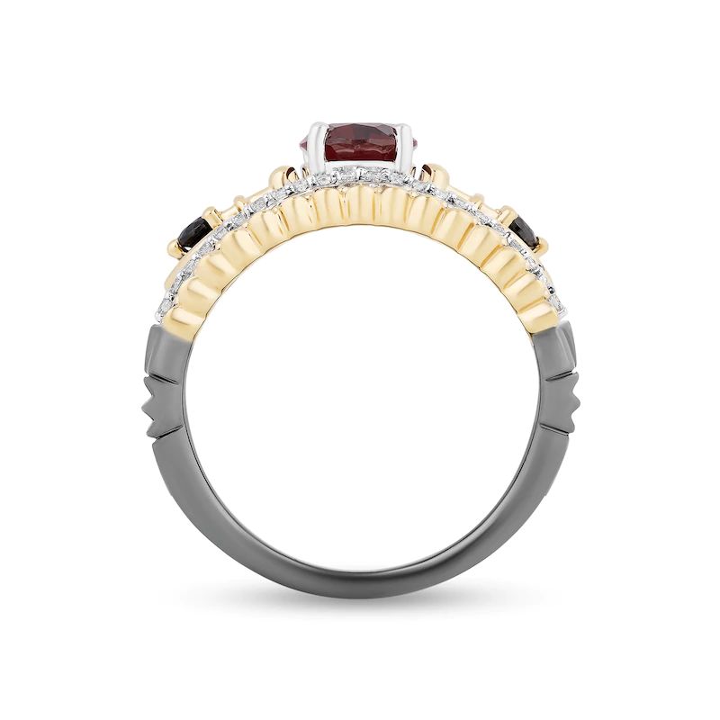 From the Enchanted Disney Fine Jewelry Villains Collection inspired by the Evil Queen, this gemstone and diamond ring shows off dark glamour with intoxicating details. Crafted in two-toned sterling silver and 10K gold, this choice features an 8.0 x 6.0mm oval-shaped regal red garnet – flanked by sword-pierced black enhanced diamond-centered hearts in warm gold. Shimmering white diamonds set in silver border the center design, along with alluring black enhanced diamonds and scalloped gold ribbons. Crowns insets gleam lower down the black rhodium-plated shank to complete this royal look. Captivating with 1 ct. t.w. of diamonds and a brilliant buffed luster, this split-shank style is more than you can imagine. This ring is available in size 7 only. ?Disney