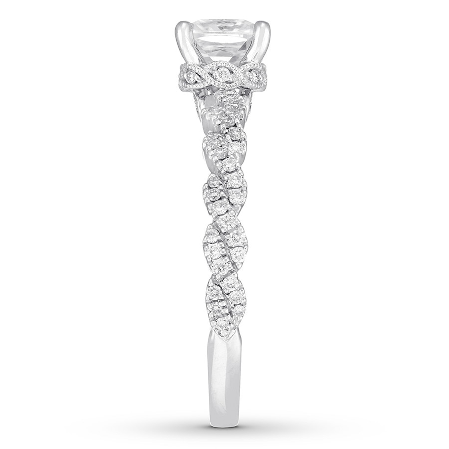 This spectacular engagement ring from the Neil Lane? Premiere collection features a stunning, modern design enlivened by an impressive array of independently certified diamonds. The brilliant 1-carat, cushion-cut diamond center pairs with dazzling twists of round diamonds on the band for a romantic look. Styled in 14K white gold, the ring has a total diamond weight of 1 1/5 carats.