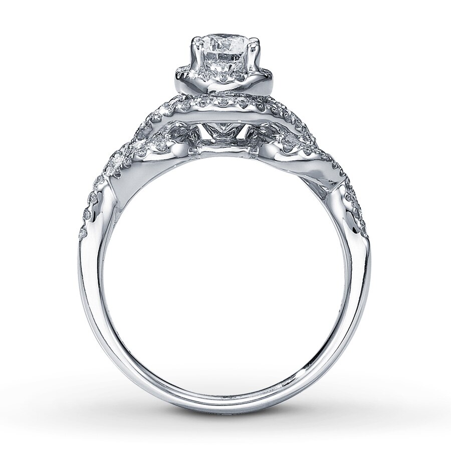 A captivating round diamond in this dazzling engagement ring will take her breath away. Additional pave diamonds in romantic twists of 14K white gold complete the look. This fine jewelry ring has a total diamond weight of 1 carat. Available online while supplies last. Previously Owned Jewelry is not eligible for in-store pickup. Previously Owned Jewelry may only be shipped either to your home address or to an alternate address.