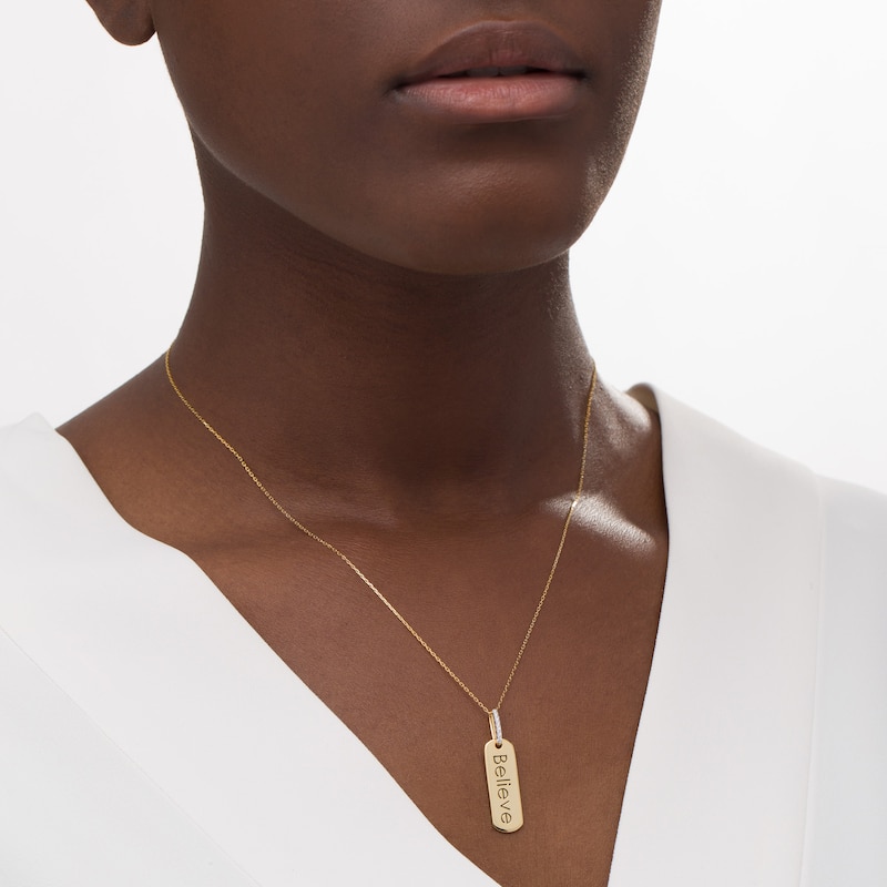 Wear your values with pride with this statement-making diamond pendant from the Wonder Woman Collection. Crafted in warm 10K gold, this petite tag features the word "Believe" inscribed vertically along the center. Diamonds line the bail for a hint of sparkle. Captivating with 1/20 ct. t.w. of diamonds and a bright polished shine, this pendant suspends along a 16.0-inch cable chain with 2.0-inch extender that secures with a spring-ring clasp. The Wonder Woman Collection of fine jewelry at Zales is inspired by one of the most beloved and iconic DC Super Heroes of all time. Embodying strength and grace, Wonder Woman is a modern-day warrior. This exclusive fine jewelry collection inspires you to wear your strength, confidence and power.