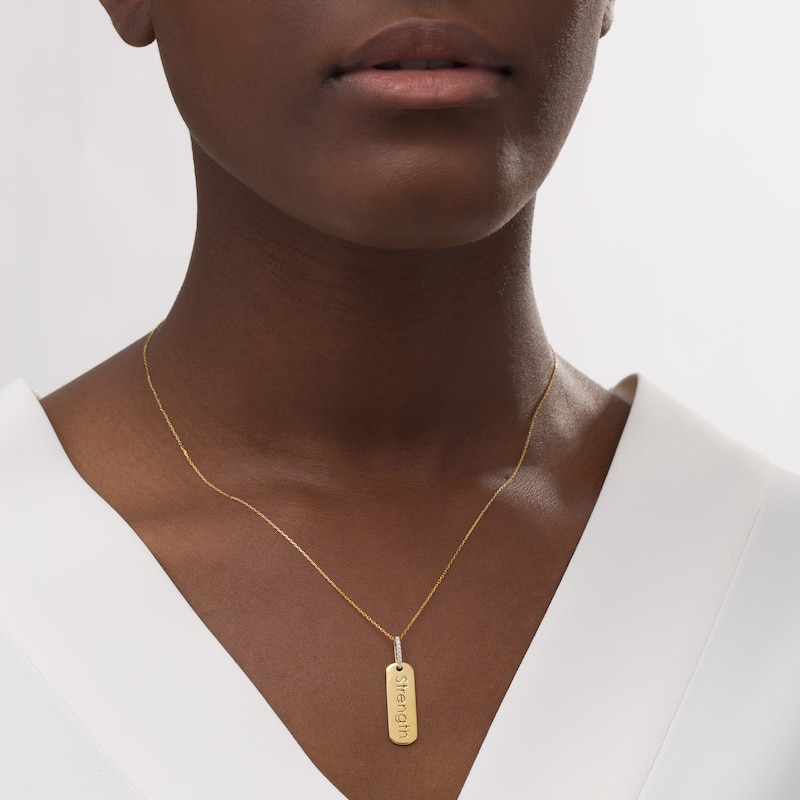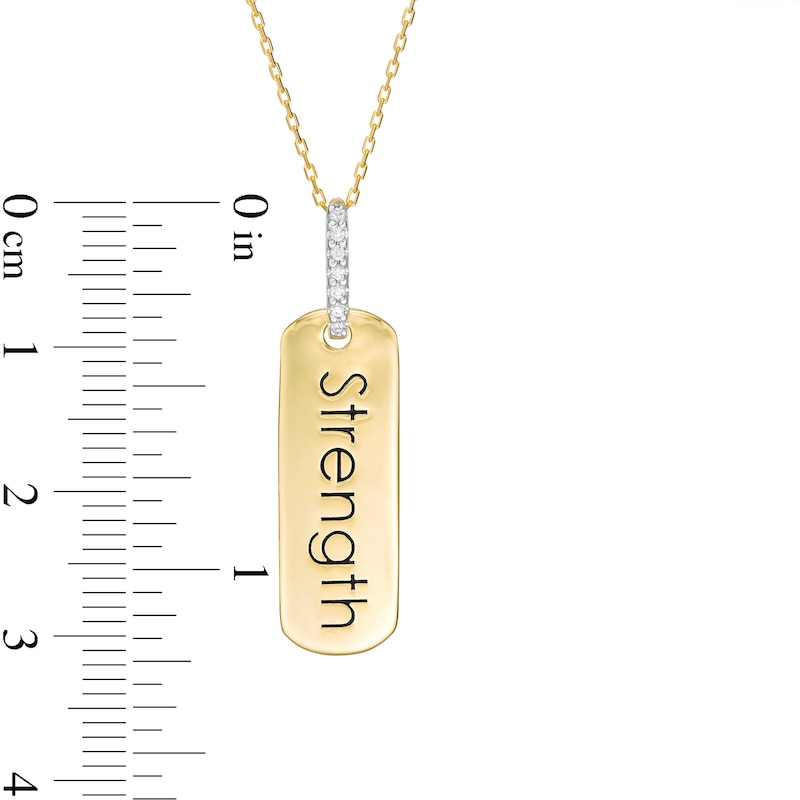 Wear your values with pride with this statement-making diamond pendant from the Wonder Woman Collection. Crafted in warm 10K gold, this petite tag features the word "Strength" inscribed vertically along the center. Diamonds line the bail for a hint of sparkle. Captivating with 1/20 ct. t.w. of diamonds and a bright polished shine, this pendant suspends along a 16.0-inch cable chain with 2.0-inch extender that secures with a spring-ring clasp. The Wonder Woman Collection of fine jewelry at Zales is inspired by one of the most beloved and iconic DC Super Heroes of all time. Embodying strength and grace, Wonder Woman is a modern-day warrior. This exclusive fine jewelry collection inspires you to wear your strength, confidence and power.