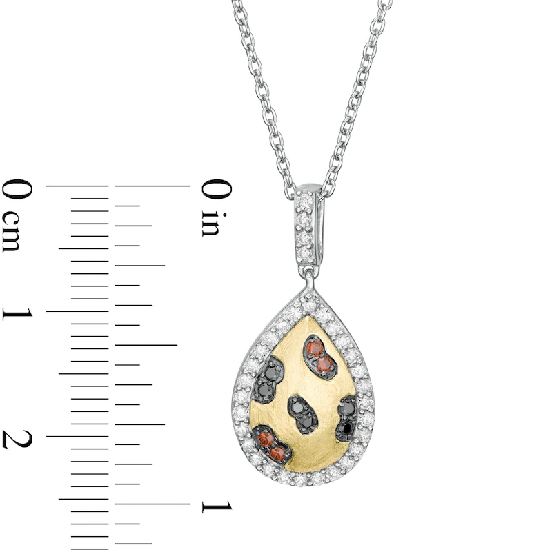 Channel your wild side with this diamond pendant from the Wonder Woman Collection. Created in sterling silver and warm 10K gold, this teardrop-shaped design showcases a brush-textured yellow gold surrounded in a silver frame of white diamonds. A nod to Cheetah, alluring enhanced black and enhanced champagne diamond "spots" add chic pattern. Captivating with 1/3 ct. t.w. of diamonds and a bright polished shine, this pendant suspends along an 18.0-inch cable chain that secures with a spring-ring clasp. The Wonder Woman Collection of fine jewelry at Zales is inspired by one of the most beloved and iconic DC Super Heroes of all time. Embodying strength and grace, Wonder Woman is a modern-day warrior. This exclusive fine jewelry collection inspires you to wear your strength, confidence and power.