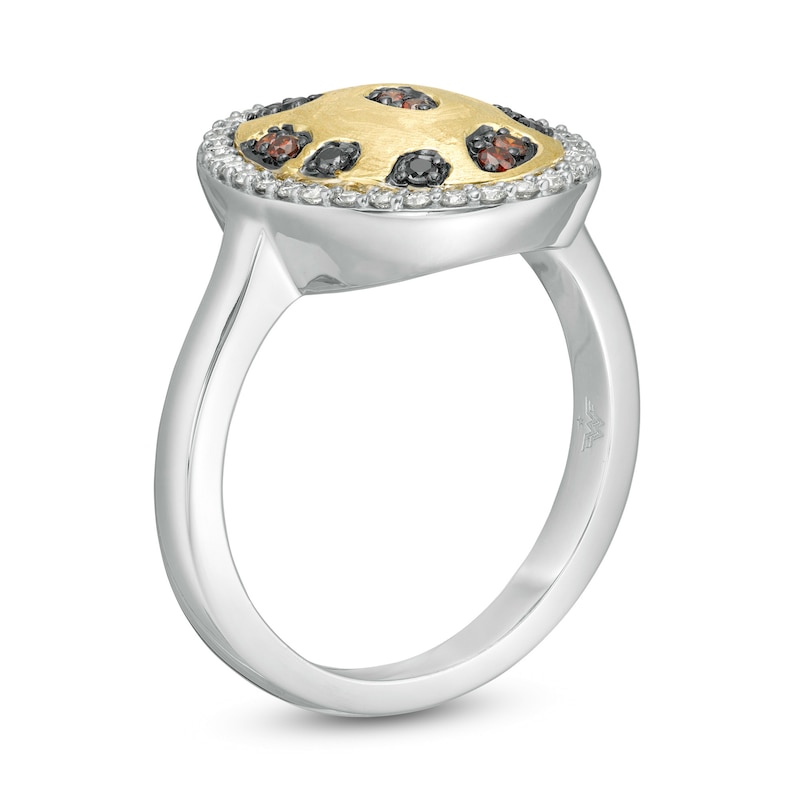 Channel your wild side with this diamond ring from the Wonder Woman Collection. Created in sterling silver and warm 10K gold, this design showcases an oval-shaped top in brush-textured yellow gold surrounded in a silver frame of white diamonds. A nod to Cheetah, alluring enhanced black and enhanced champagne diamond "spots" add chic pattern to the look. Captivating with 1/3 ct. t.w. of diamonds, this ring is polished to a bright shine. The Wonder Woman Collection of fine jewelry at Zales is inspired by one of the most beloved and iconic DC Super Heroes of all time. Embodying strength and grace, Wonder Woman is a modern-day warrior. This exclusive fine jewelry collection inspires you to wear your strength, confidence and power. This ring available in size 7 only. Sterling silver rings cannot be resized after purchase.